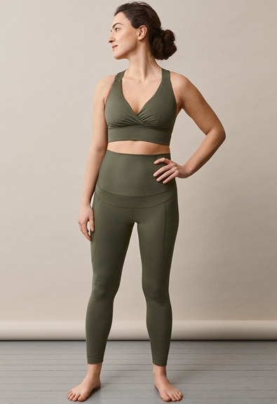 A sports bra designed to flexibly follow your curves in all kinds of activities. The bra has double layer of material in the cups and a wrap cut for easy nursing. The wide elastic band under the bust and shoulder straps provides nice support. The shoulder straps are crossed in the back for full freedom of movement. Made of a high-performance, recycled polyester that has been dyed without using water. And it gets even better: Our bra is made of „deadstock“, leftover material that we saved from the waste bin. Quite simply, a sports bra with a lot of flow and the smallest possible footprint.