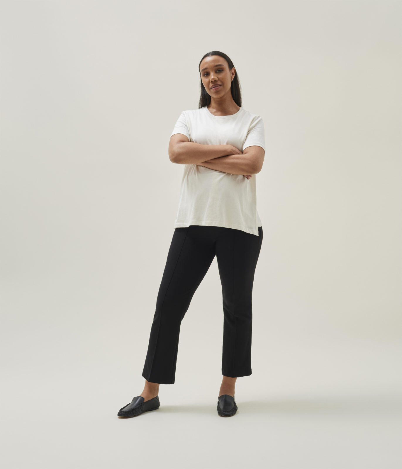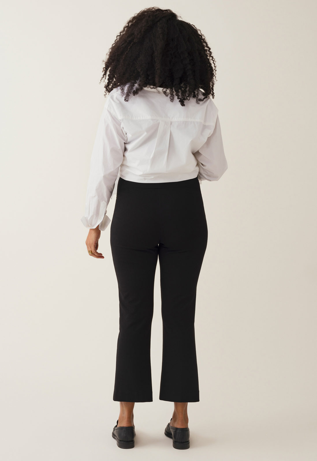 Tailored maternity pants that work just as well with your everyday sneakers as with loafers. Cut to fit perfectly before, during and after pregnancy with a wide waist cuff that can be worn folded up or down. Figure-hugging fit over the bottom, and straight legs cropped to a flattering ankle length, with a front-stitched crease.