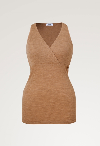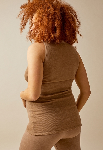 A ribbed maternity tank and nursing bra in one. Made of luxurious, soft and flexible merino wool knit that’s both breathable and moisture-wicking. The flattering wrap cut makes it super easy to access and start nursing. This wool singlet is the perfect warm layer on cold days and great for winter activities.