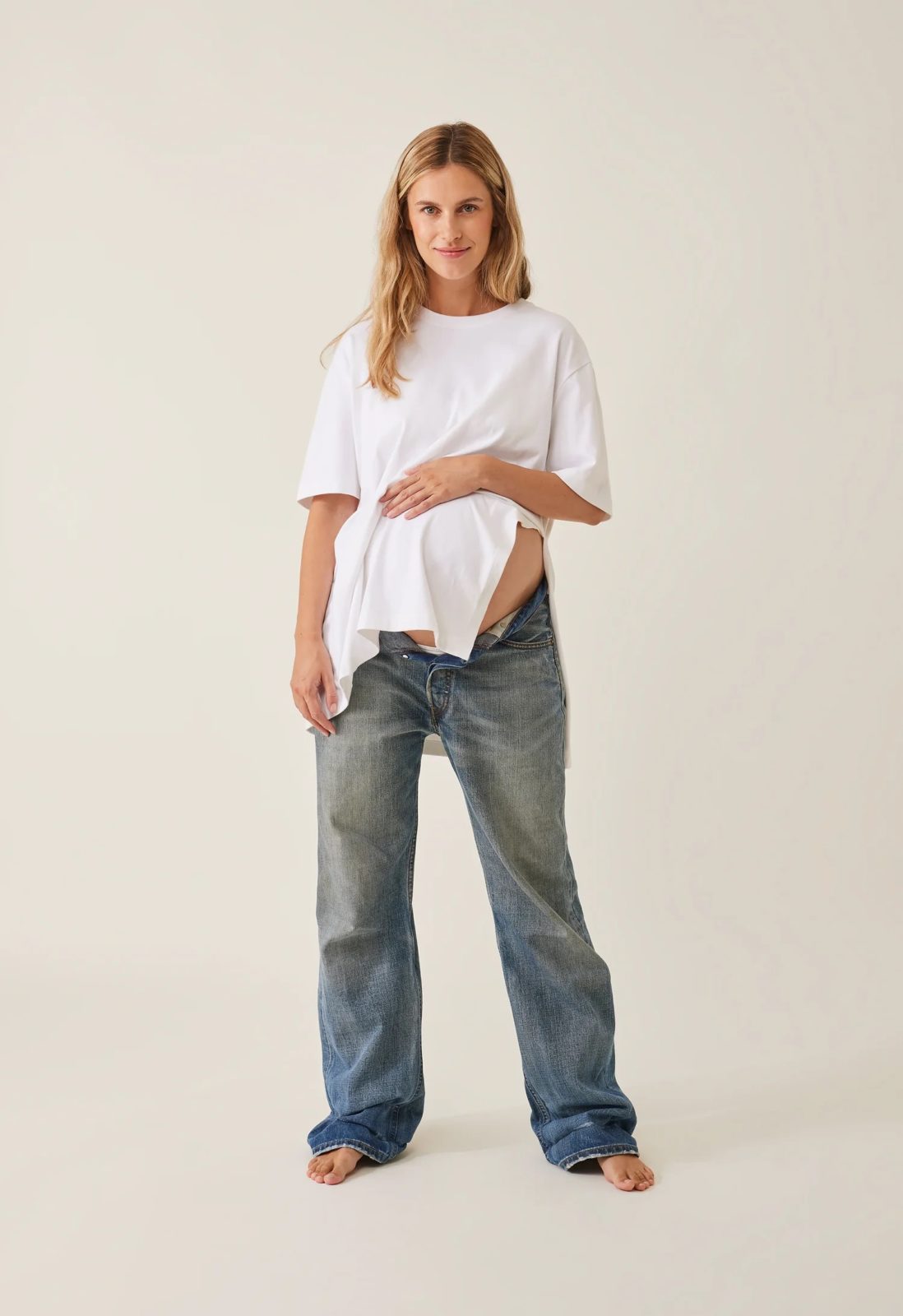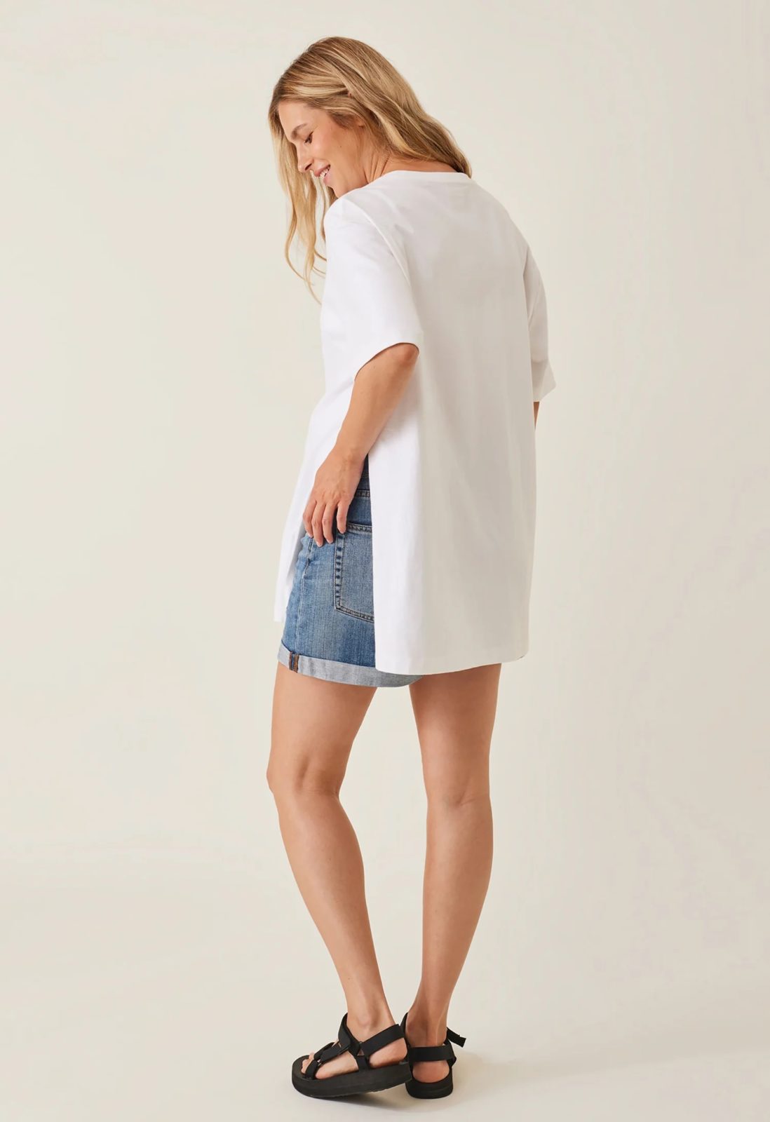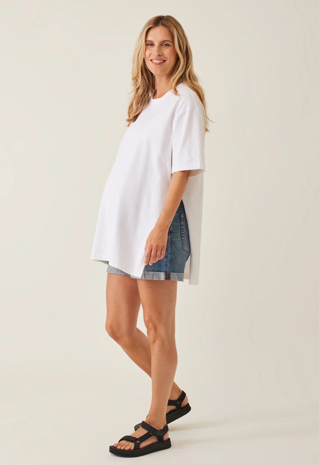 Who doesn’t love a crisp white t-shirt? Or a classic French stripe? Here’s an oversized maternity t-shirt with a slit on one side, providing plenty of room for a growing baby bump. Made from a luxurious heavy cotton jersey that gives it an extra premium feel. Thanks to its timeless design, it will fit just as lovely before, during, and after pregnancy.