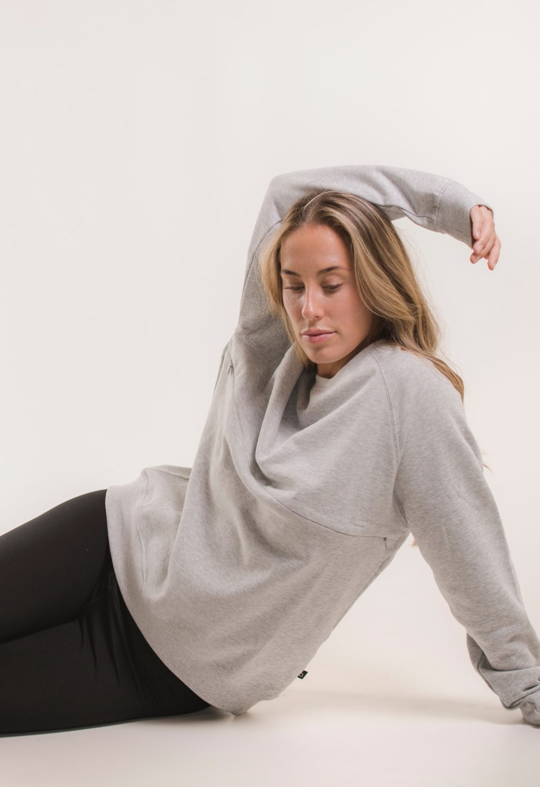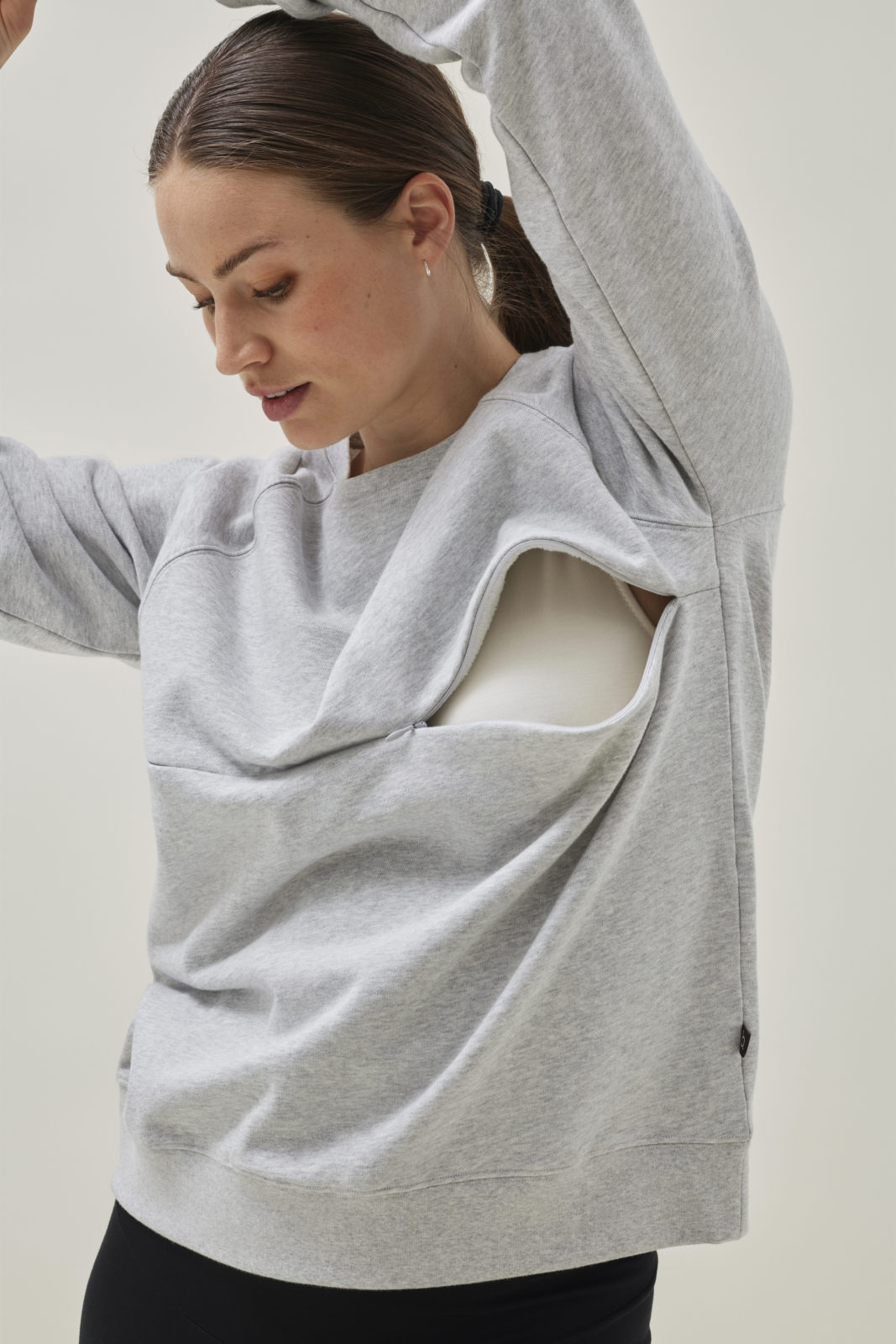 Framan á peysunni er tvöfaldur rennilás sem veitir einstaklega gott aðgengi fyrir brjóstagjöf án þess að vera áberandi. Peysan er með flísefni yfir brjóstasvæðið sem heldur hita á brjóstunum og verndar þannig viðkvæmt mjólkurflæði sem dregur úr áhættunni á bólgum og stíflum.