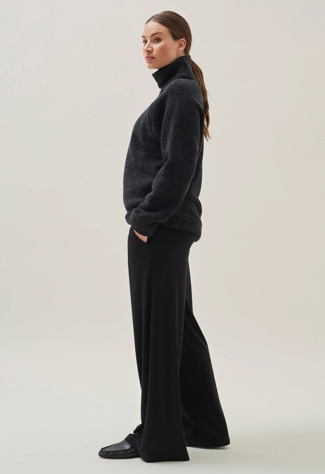 Upplifðu þægindi sem endast lengur en meðgangan sjálf með þessum æðislegum buxum, hönnuðum til að vera jafn þægilegar á meðgöngu og eftir hana. Buxurnar eru unnar úr blöndu af bambusviskósu, bómull og teygju, sem gefur þeim einstaka mýkt og sveigjanleika. Buxurnar eru síðar með víðu skálmisniði, breiðum mittisstreng sem má bæði hafa uppi eða brjóta niður, ásamt hentugum hliðarvösum. Þessar verða þínar uppáhalds !!
