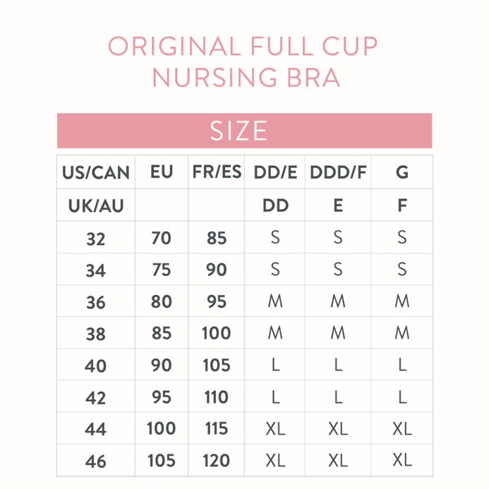 Bravado Original kemur í stærðum small-medium-large-xlarge. Hver stærð í haldarnum nær til fleiri skálastærða heldur en hefðbundið er. Bravado Original full cup er með stærri skálum og kemur í stærðum small-medium-large-xlarge. Sjá stærðartöflur í myndum.
