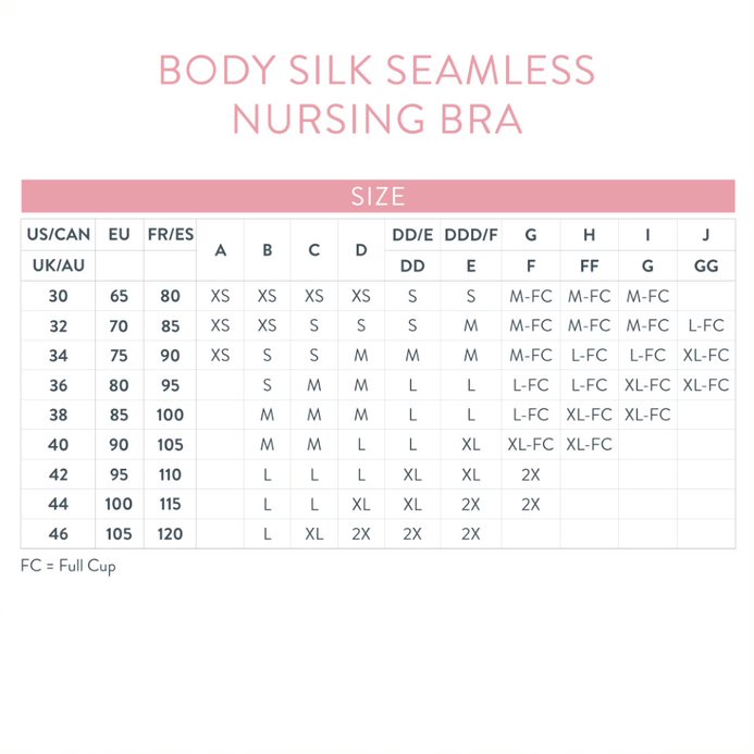 Bravado silky seamless kemur í stærðum small-medium-large-xlarge-xxlarge. Hver stærð í haldarnum nær til fleiri skálastærða heldur en hefðbundið er. Einnig er hægt að fá hann með stærri skálum (FC = full cup) í stærðum medium, large og xlarge. Sjá stærðartöflu í myndum.