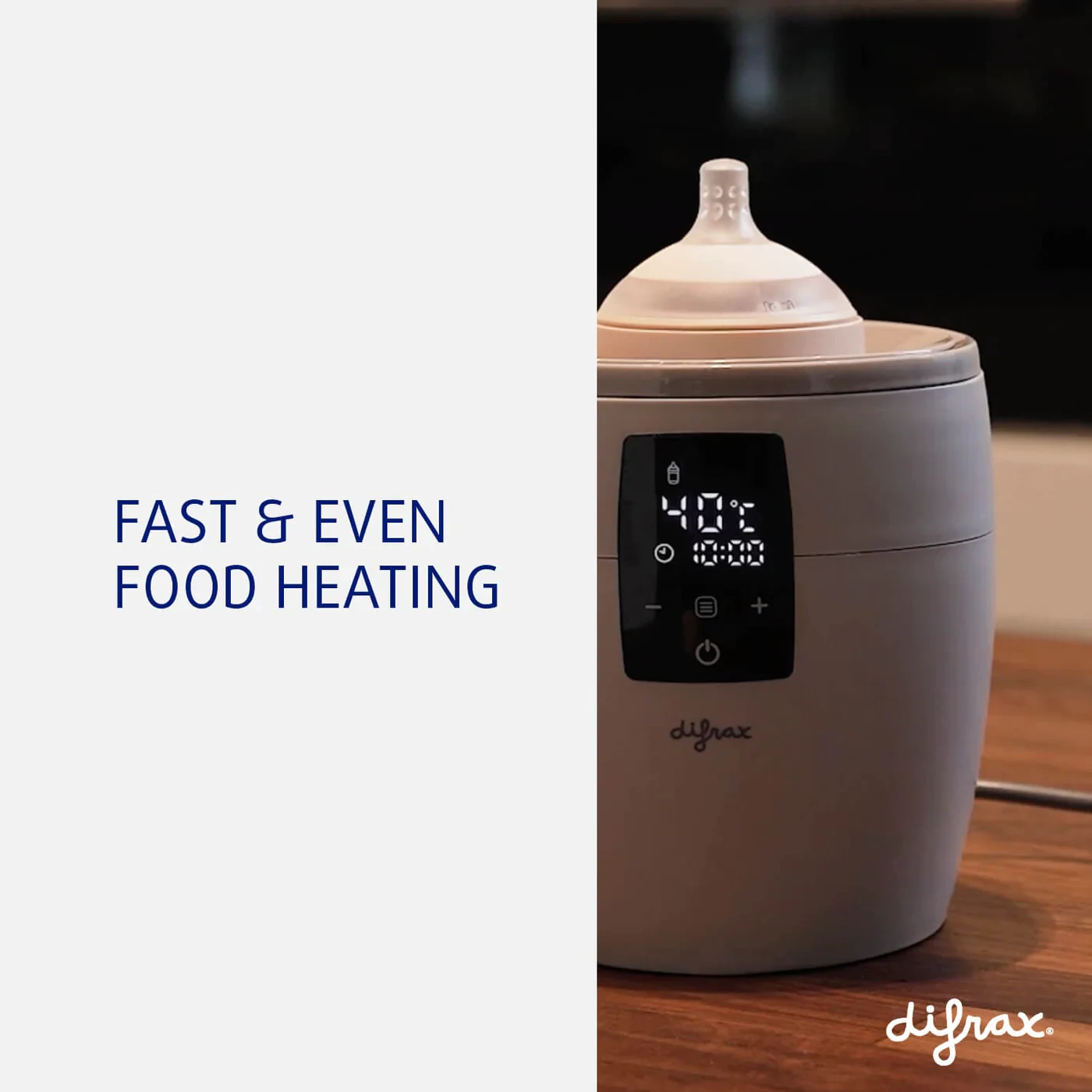 Difrax pelahitarinn er hentugur til að hita pela hratt og örugglega. Pelinn hefur einnig stillingar til að afþýða og halda pelanum heitum í langan tíma.