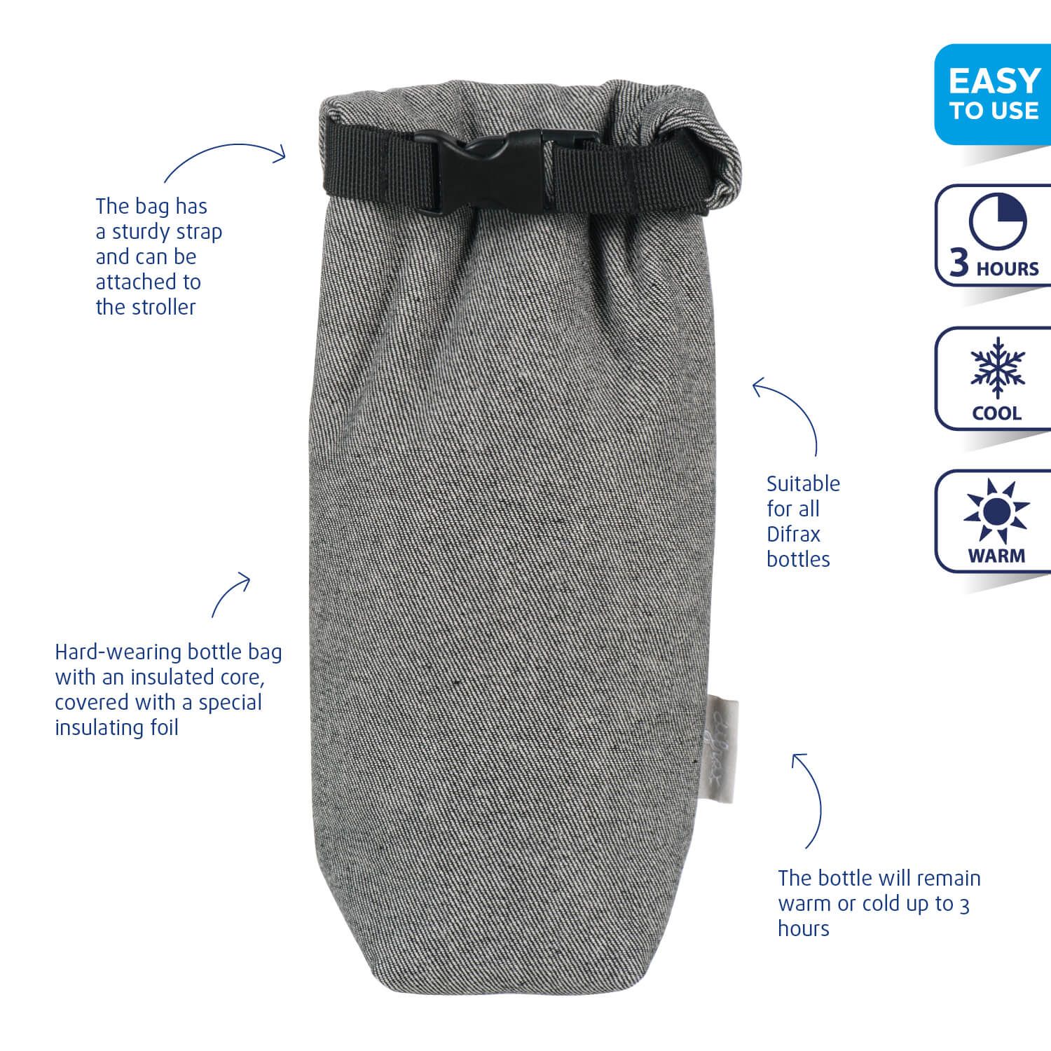 The Difrax S-Baby Bottle Thermal Bag is lined with a special hot/cold insulating foil. It can also be used for keeping prepared infant formula at a cool temperature.