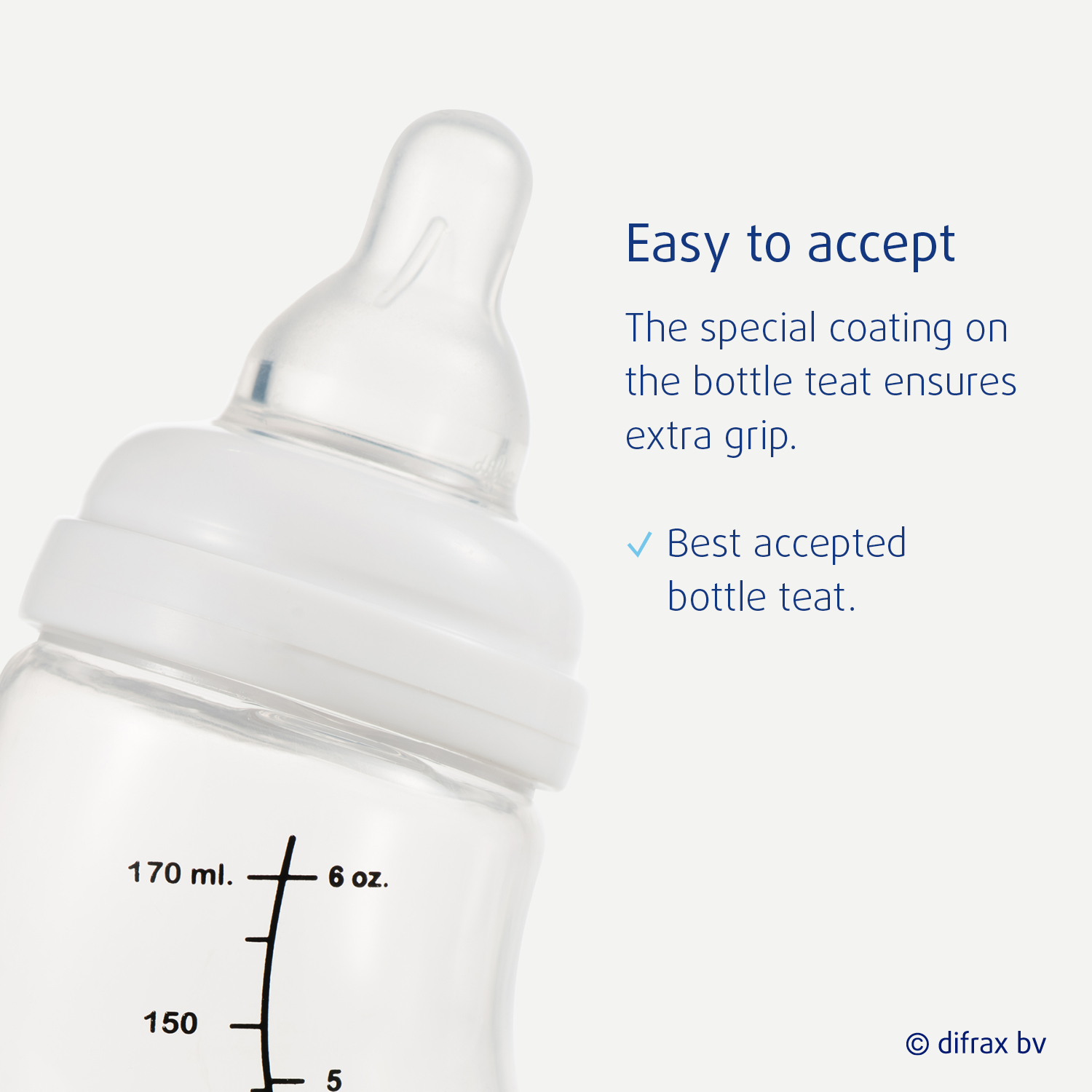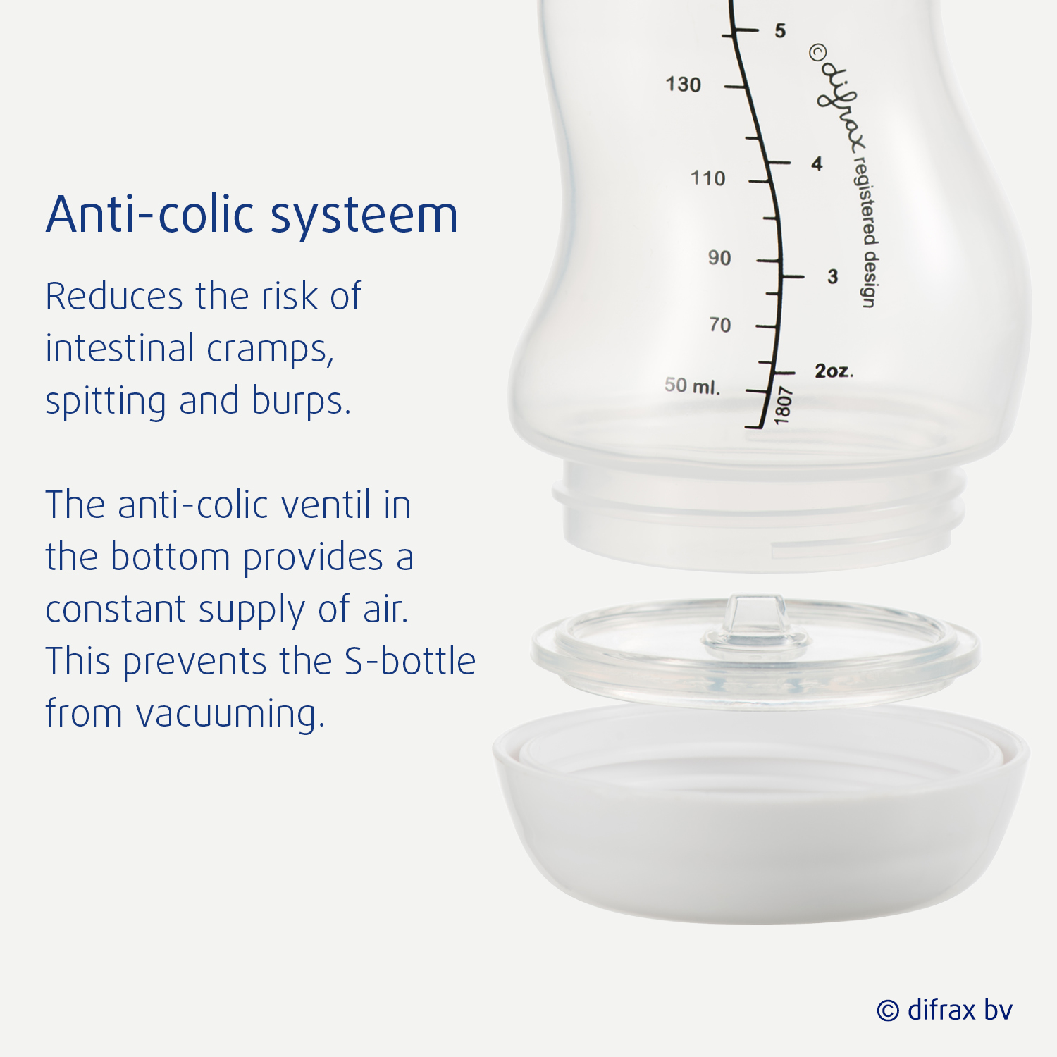 The Difrax S-baby bottle with anti-colic valve for preventing colic is the most popular baby bottle in the Netherlands. The shape of the nozzle is easy for babies to accept. This makes it easier for both you and your baby to combine bottle feeding and breastfeeding.