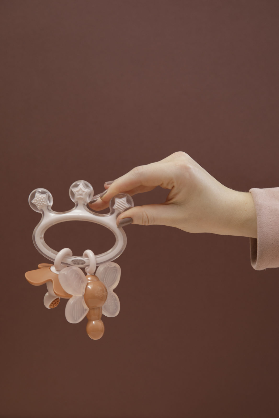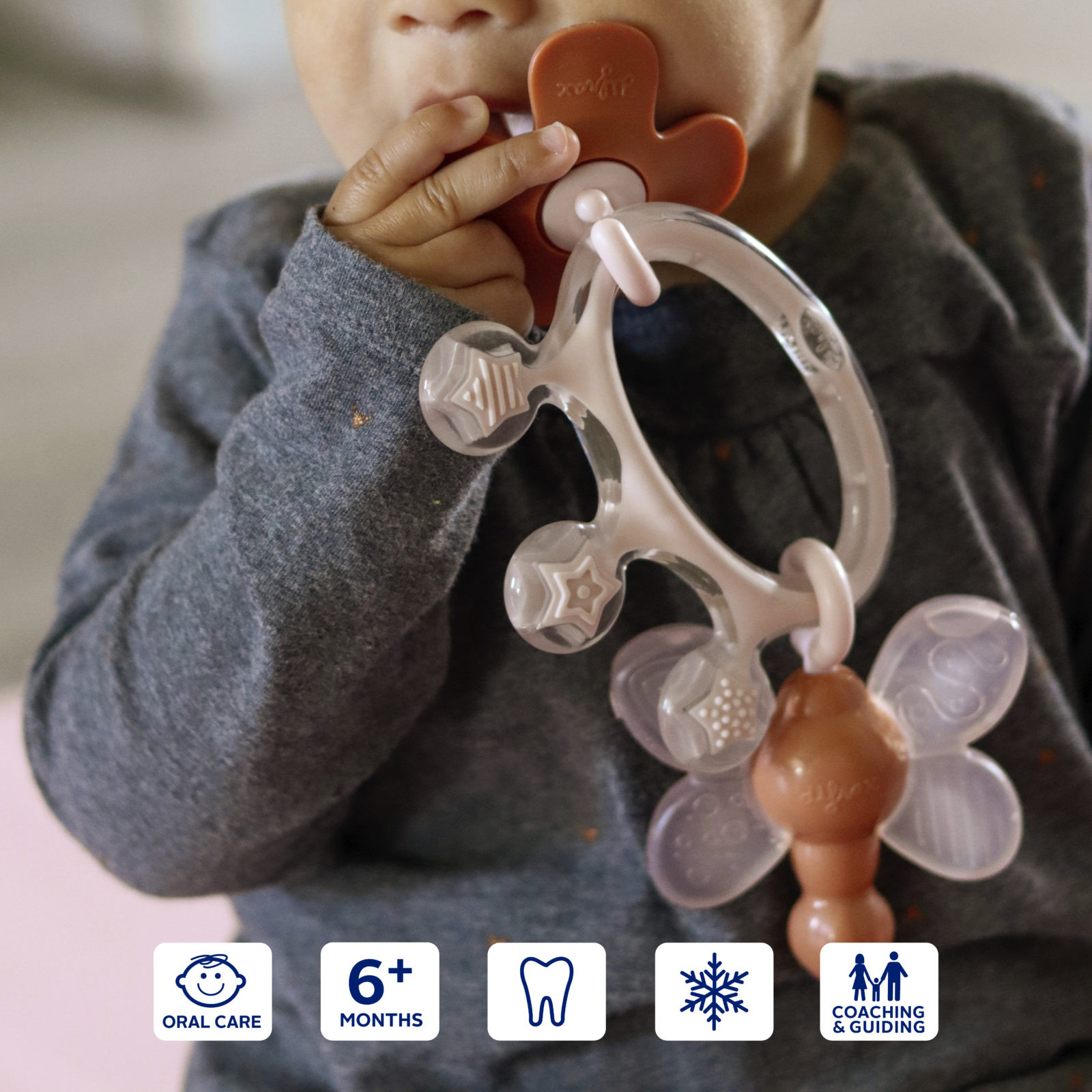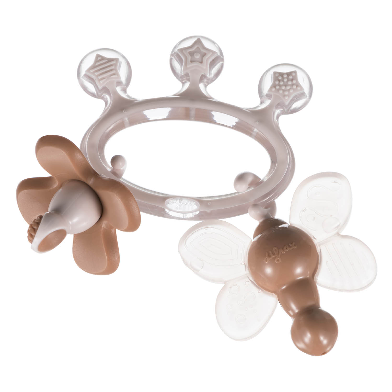 The Flower supports oral care and the Dragonfly teether changes colour when it is chilled and provides relief for baby teething symptoms. To cool: place the teether in the refrigerator – not in the freezer – for half an hour. The Crown teething ring is filled with safe, sterilised water.
