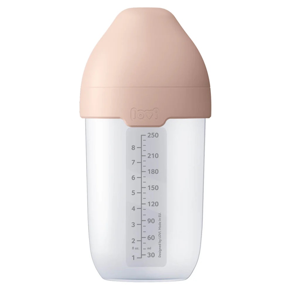 Difrax LOVI has developed an innovative Mammafeel bottle that resembles the mother’s breast as much as possible in terms of shape, texture and dynamics. The soft feel resembles mummy’s skin and ensures an easy and safe transition from breast to bottle. The special dynamic expandable teat moves with your baby’s natural sucking rhythm. As with breastfeeding, nutrition flows out of the bottle when your baby is actively drinking. This way of drinking is different from our Difrax S-bottle. You may need to give your child a little time to learn this. The sturdy, wide base with soft coating ensures a tight fit to the bottle teat. Baby’s mouth is supported by the firm base and the lips are positioned correctly. The soft coating provides extra grip during drinking and prevents the mouth from sliding on the teat surface. The unique design of the bottle teat promotes correct drinking posture and free breathing through the nose. This prevents your baby from ingesting unnecessary air through the mouth and prevents intestinal cramps. The teat’s soft surface mimics the skin and texture of the mother’s breast. This protects the bond between you and your baby, and provides a natural drinking sensation.- As soft as mother’s skin