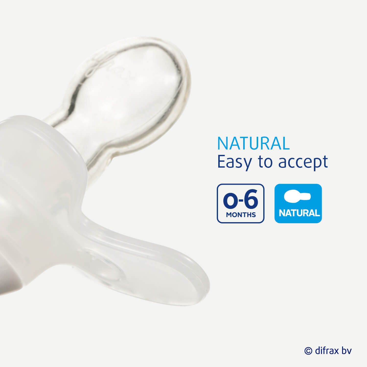 The Difrax Natural Pacifier 0-6 months fulfils your baby’s need to suckle. The pacifier nozzle is round and convex-shaped, making it ideally suited for children who are able to turn the pacifier around in their mouth. The size of the shield and nozzle are specially adapted to new born babies and infants up to 6 months.