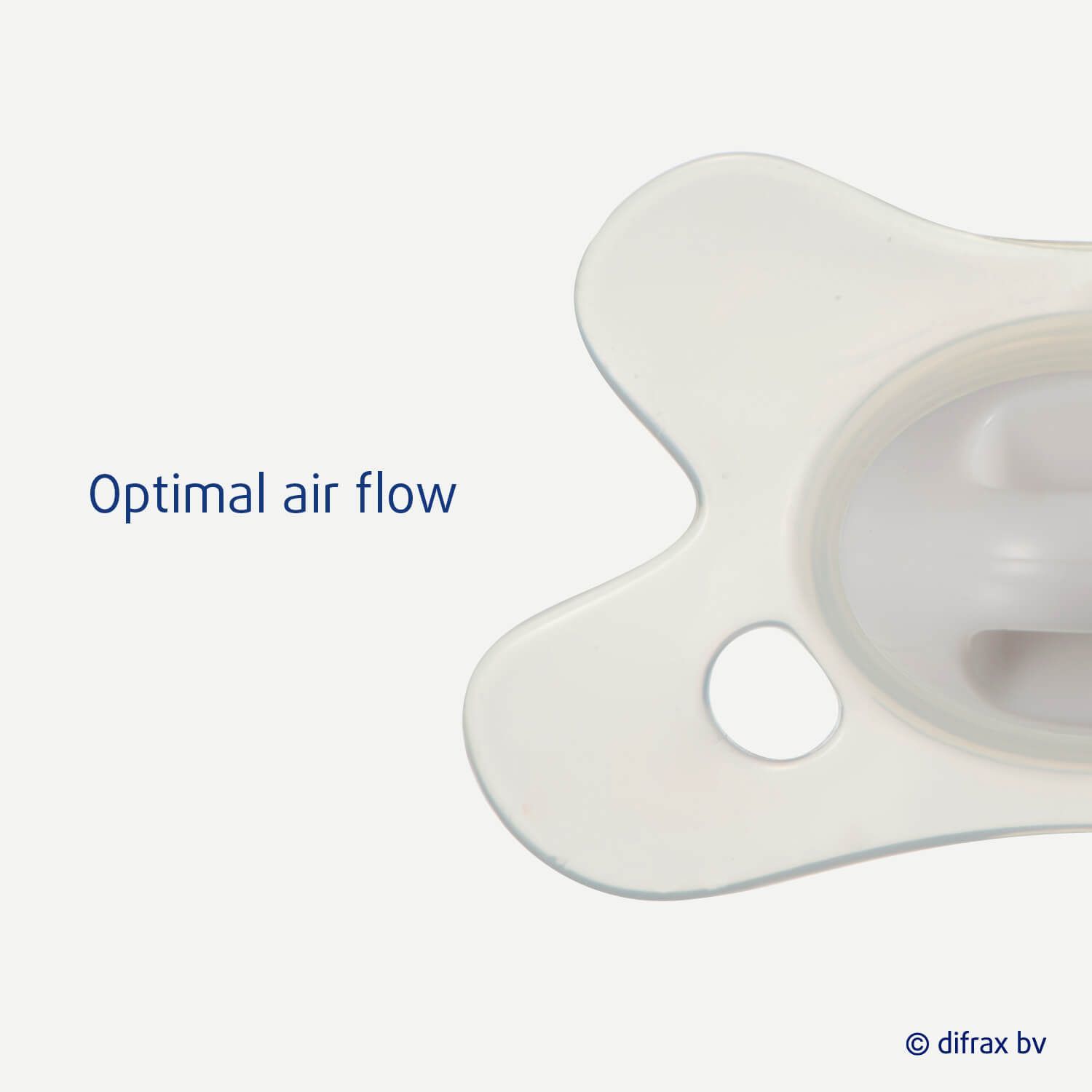 The unique pacifier has a butterfly shaped shield ensuring a perfect fit to your baby’s face. The recess for the nose enables your baby to breathe freely through the nose. Two airy holes on each side provide additional airflow, preventing skin irritation.