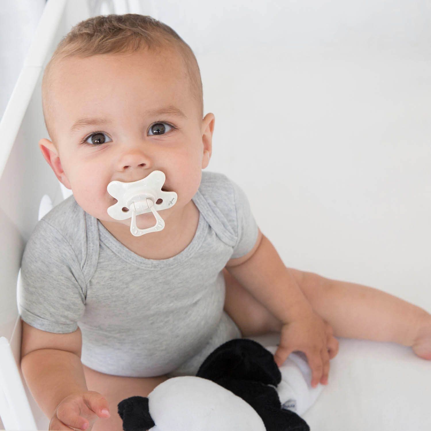 The unique pacifier has a butterfly shaped shield ensuring a perfect fit to your baby’s face. The recess for the nose enables your child to breathe freely through the nose. Two airy holes on each side provide additional airflow, preventing skin irritation.