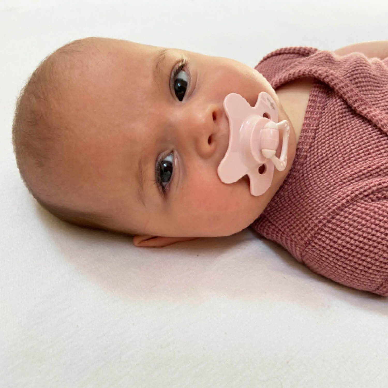 * Þar sem skjöldur snuðanna er fiðrildalagaður, falla þau vel að andliti barnsins og það loftar vel um vitin.