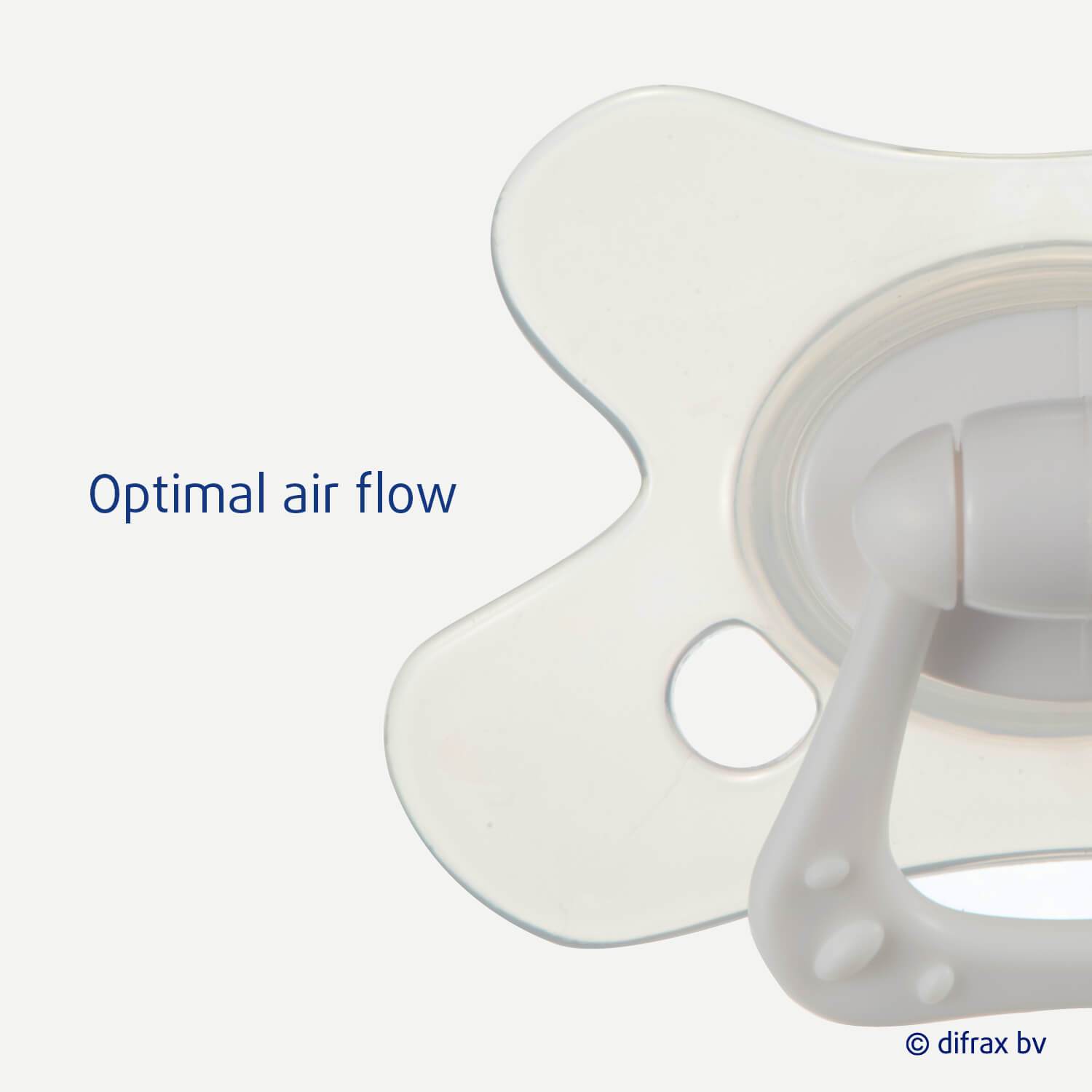 The unique pacifier has a butterfly shaped shield ensuring a perfect fit to your baby’s face. The recess for the nose enables your child to breathe freely through the nose. Two airy holes on each side provide additional airflow, preventing skin irritation.