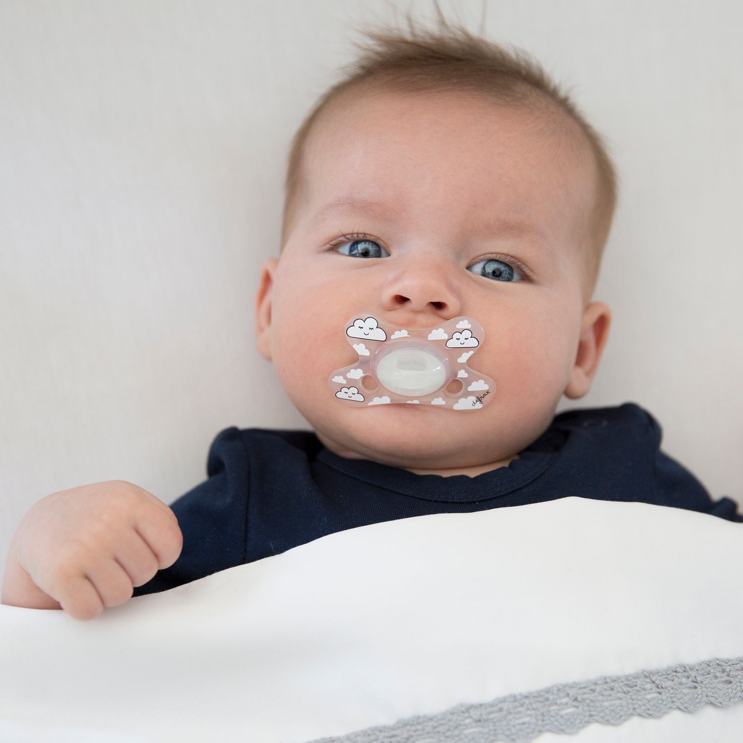 This unique pacifier has a butterfly shaped shield ensuring a perfect fit to your baby’s face. The recess for the nose enables your baby to breathe freely through the nose. Two air holes on each side provide additional airflow, preventing skin irritation.