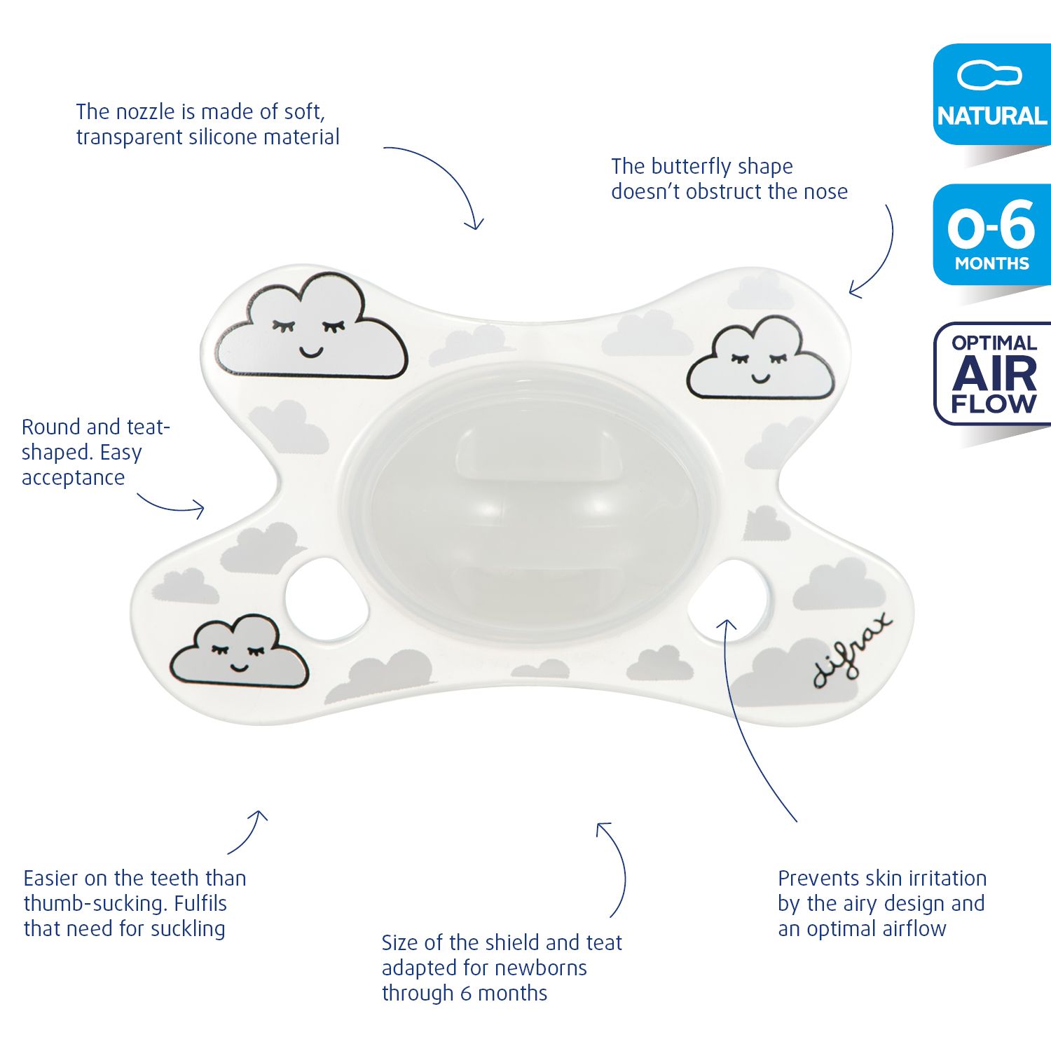 The Difrax Natural Pacifier 0-6 months fulfils your baby’s need to suckle. The pacifier nozzle is round and convex-shaped, making it ideally suited for children who are able to turn the pacifier around in their mouth.