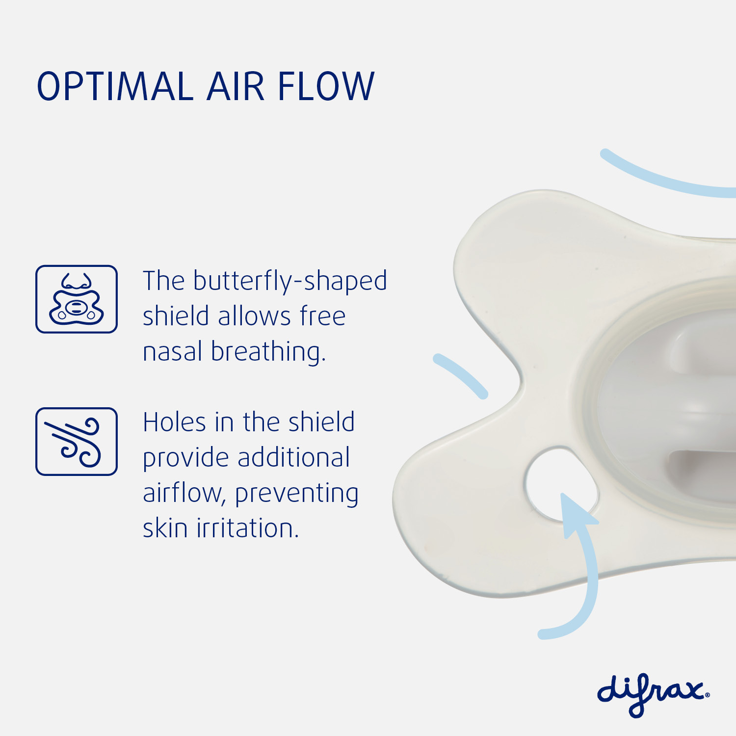 The unique pacifier has a butterfly shaped shield ensuring a perfect fit to your baby’s face. The recess for the nose enables your baby to breathe freely through the nose. Two airy holes on each side provide additional airflow, preventing skin irritation.