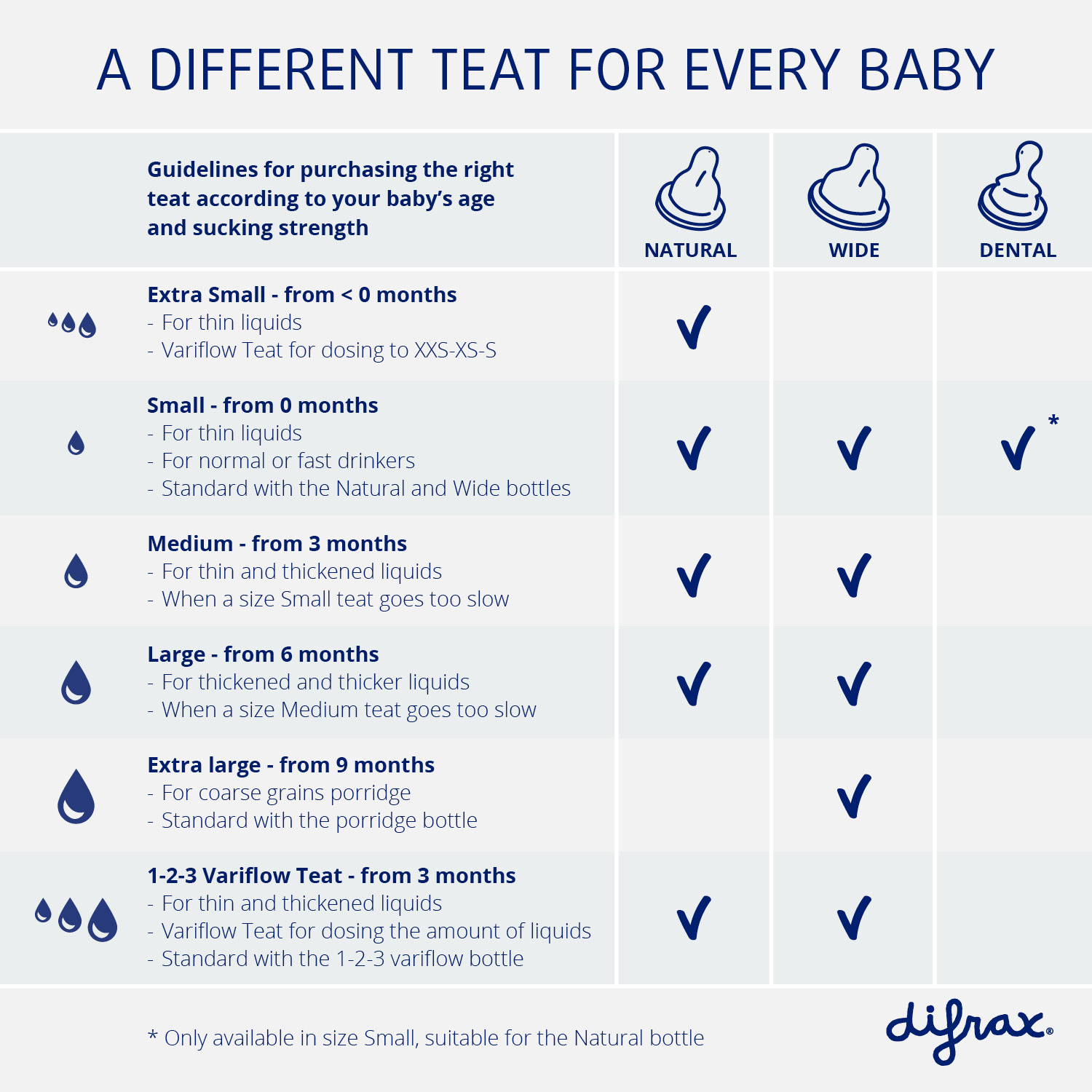 Large: from the age of 3 months and older or if size Medium is too slow for your baby. Suitable for thick nutrition such as milk porridge. 2-pack. The teat is made of safe, silky soft, BPA-free silicone material. Developed by the Difrax medical team.