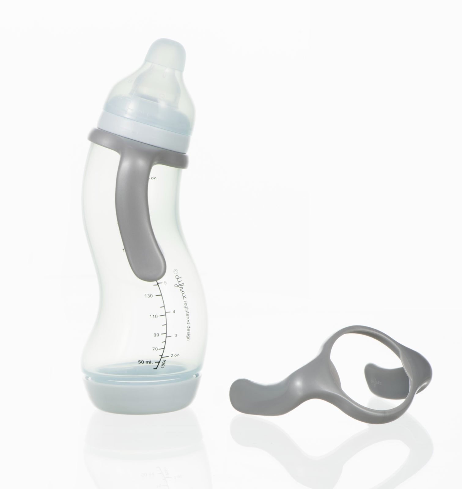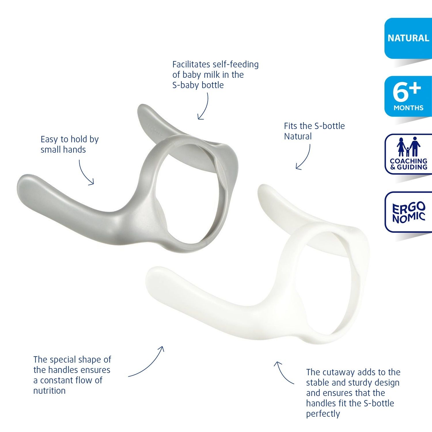 The gray and white Difrax Easy grip handles for the S-baby bottle Natural can be attached to the S-baby bottle 170 ml and 250 ml.