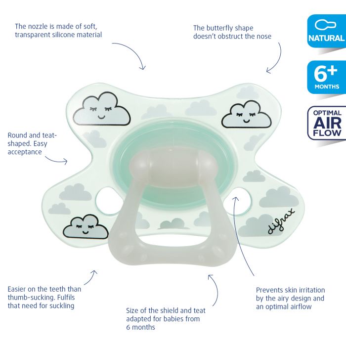 This unique pacifier has a butterfly shaped shield ensuring a perfect fit to your baby’s face. The recess for the nose enables your baby to breathe freely through the nose. Two air holes on each side provide additional airflow, preventing skin irritation. The pacifier comforts, consoles and relaxes your child. Difrax pacifiers are available in many fashionable prints and various sizes. Difrax advises you replace your baby’s pacifier every six weeks. Check the pacifier daily before use for any damage by pulling firmly on the nozzle.