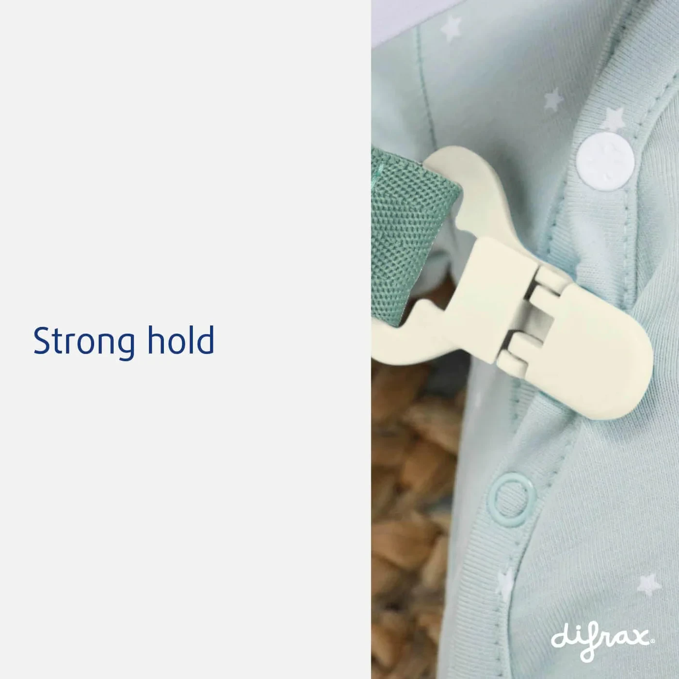 Never lose another pacifier thanks to the Difrax Pacifier clip. A lost pacifier usually causes trouble. The Difrax pacifier clip is a convenient and safe pacifier clip which you can attach to a pacifier. You then attach the clip to your child’s clothing so that the pacifier does not get lost or fall on the floor. This means that the pacifier is always within reach. As well as being safe and convenient, this pacifier clip is also stylish. Available in a number of modern colours.