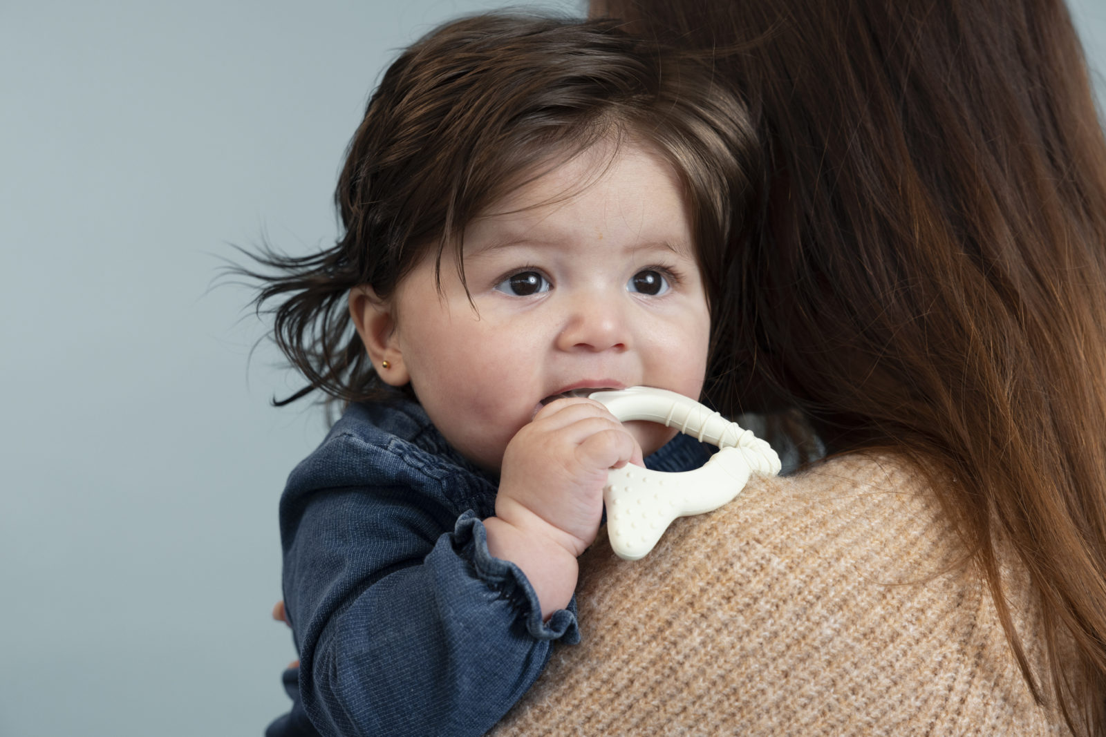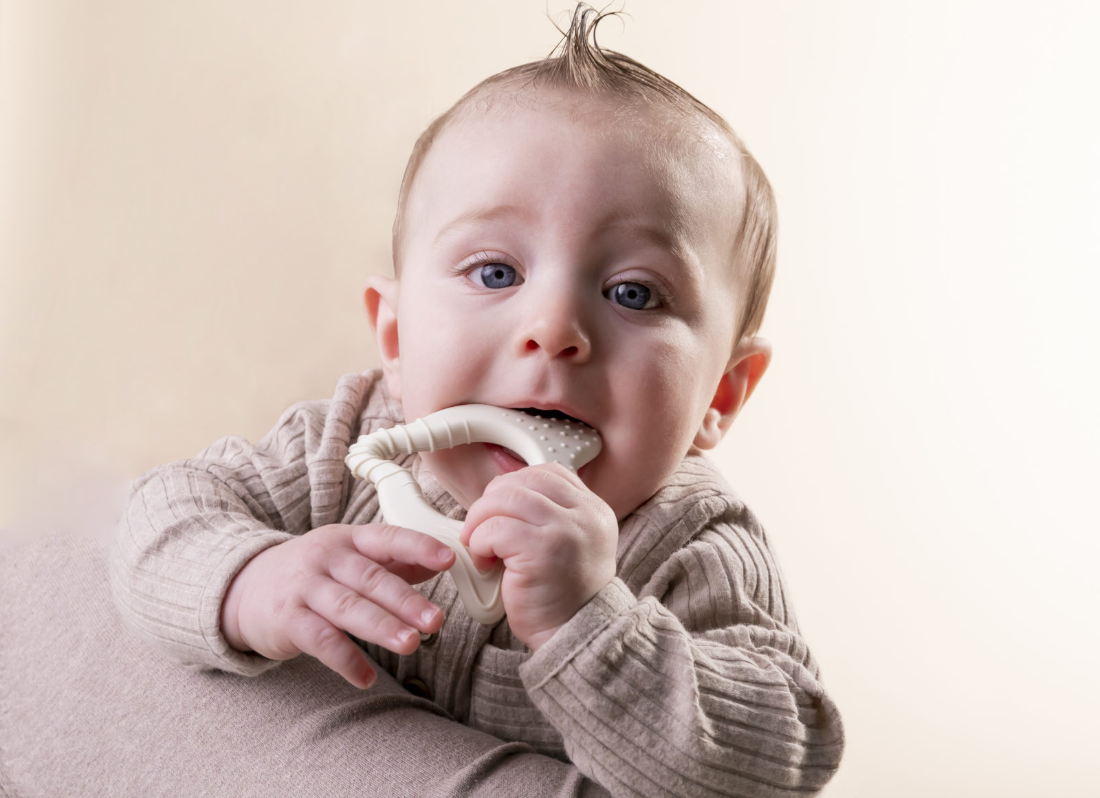 * Auk þess er tanntökuhringurinn þroskaleikfang fyrir barnið. Þar sem lögun hringsins er sveigð og opin, gerir hún litlum höndum auðvelt fyrir að halda í hann og um leið örvar fínhreyfingar.