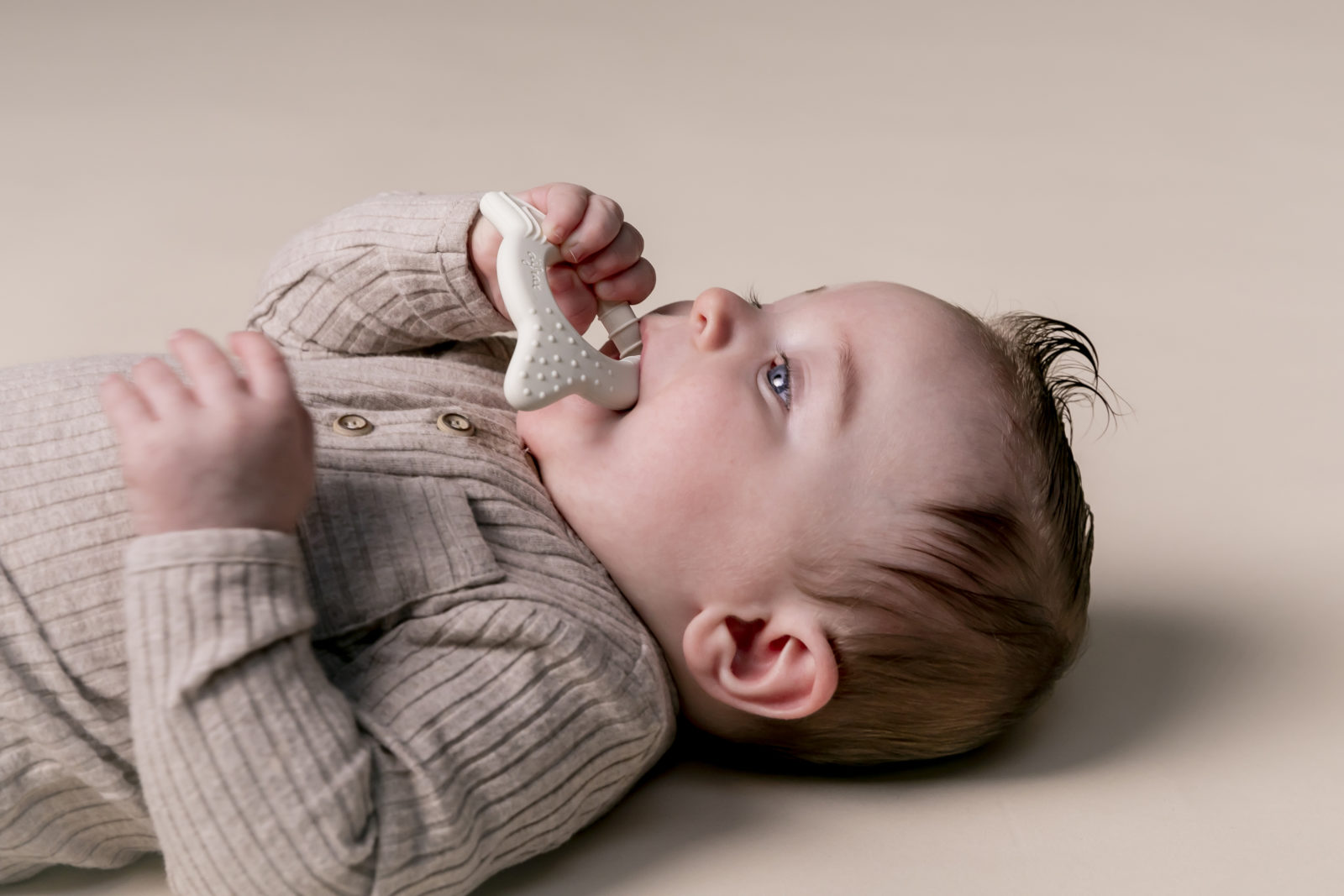 The curved, open shape makes the teether easy to grip and stimulates fine motor skills.