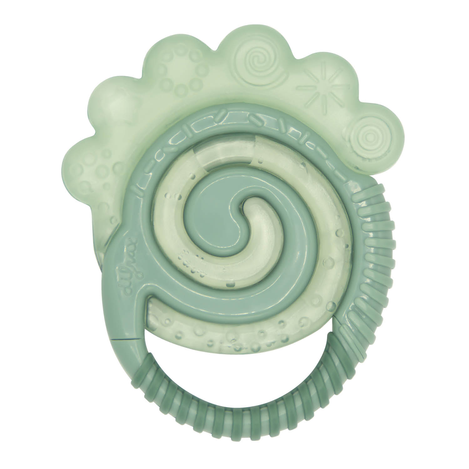The hard part has a bumpy surface structure that massages the gums. The teething ring can be chilled, providing babies additional relief for their teething pain.