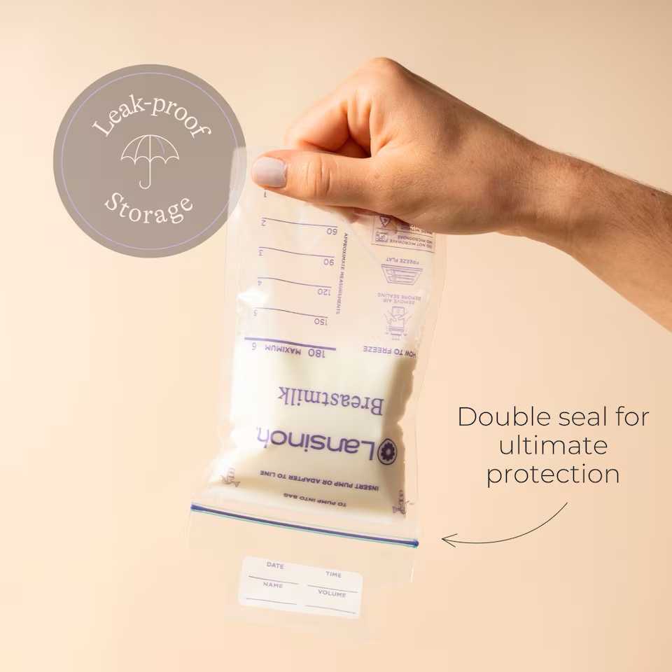 Frystipokar fyrir brjóstamjólk með tvöföldum rennilás til að tryggja lokun. Eru með sérstökum flipa til að skrifa á dagsetningu.