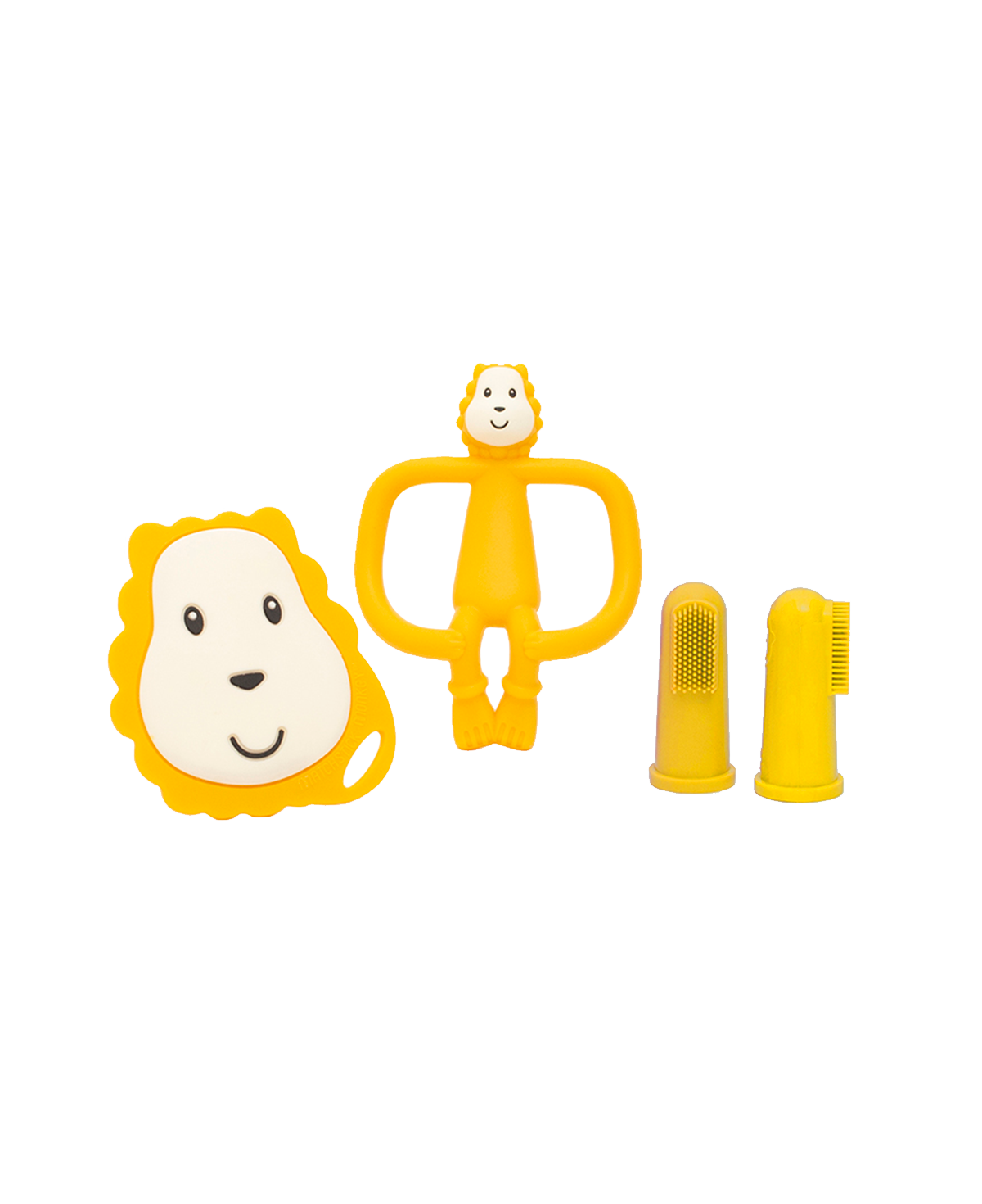 Gjafasettin frá Matchstick Monkey innihalda nagdýr, flat face og tvo fingratannbursta.