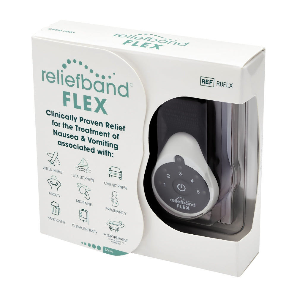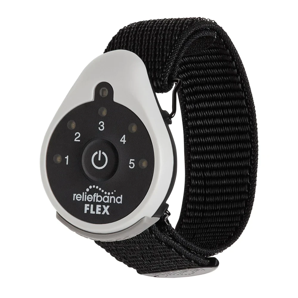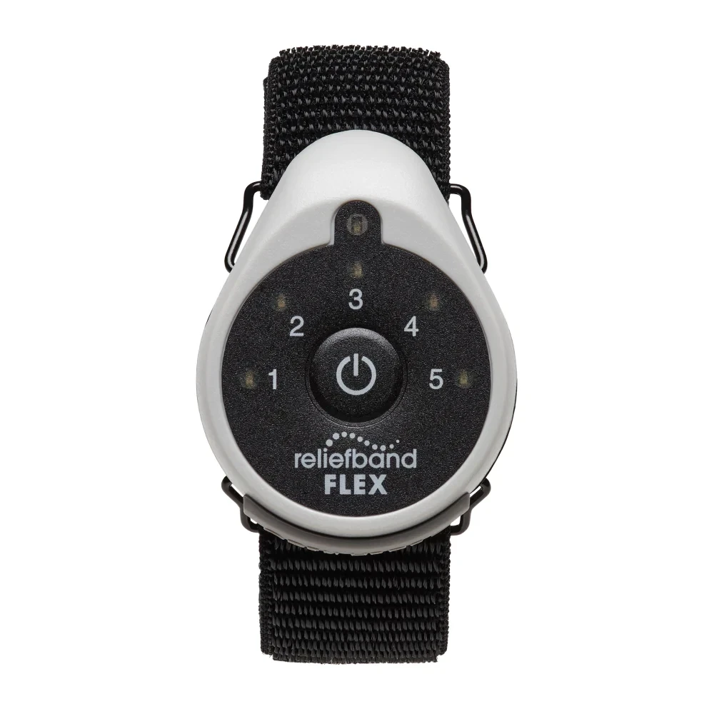 Reliefband® Flex is an economical, digital therapeutic device indicated for use in the treatment of nausea and vomiting due to motion sickness, morning sickness associated with pregnancy, and chemotherapy. Reliefband is also indicated as an adjunct to antiemetic therapy in reducing postoperative nausea.